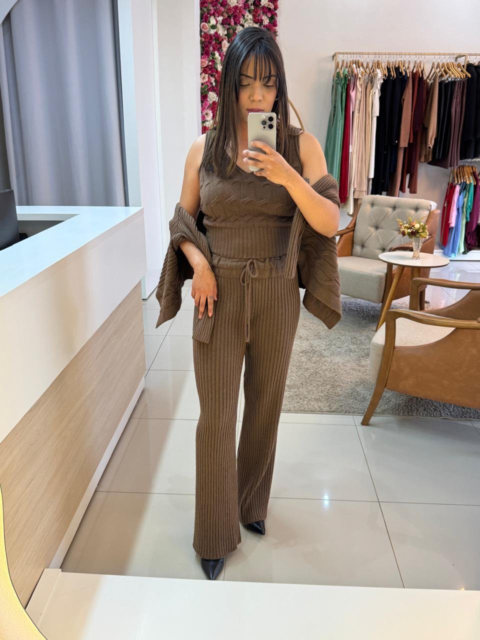Conjunto em tricô 3 peças, um dos melhores tricô do Brasil, estiloso e atemporal, que podem ser usadas separadamente, compondo diversos looks conforme a sua criatividade.